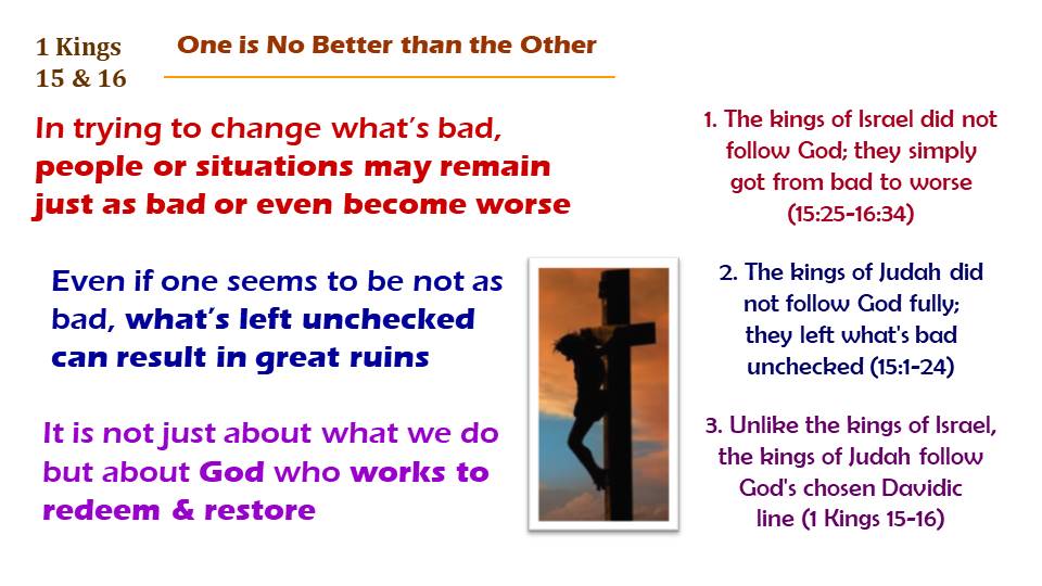 1. The kings of Israel did not follow God; they simply got from bad to worse (15:25-16:34)